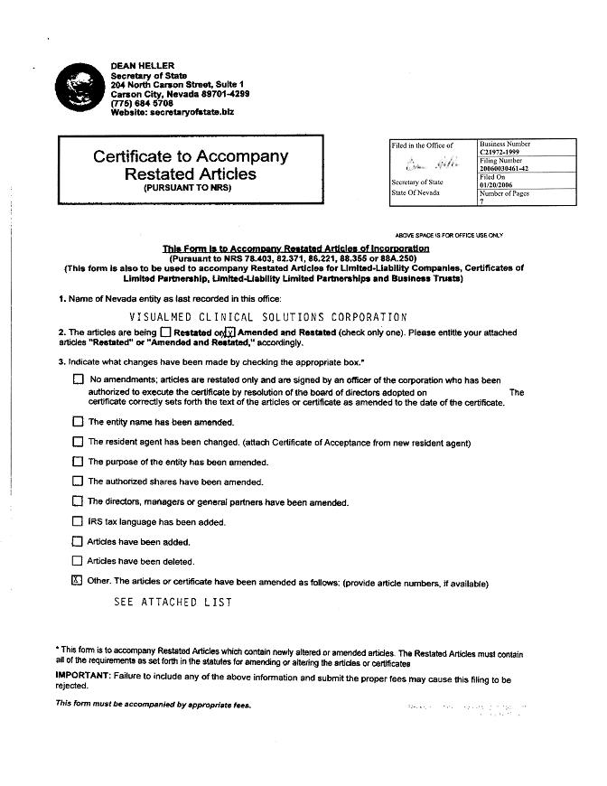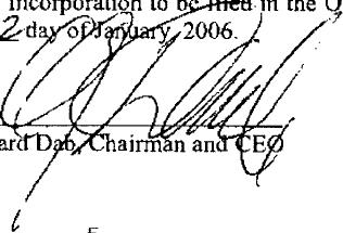 Pursuant to the provisions of NRS 78.403 of the Nevada General Corporation Law (the “Act”), the undersigned corporation hereby amends and restates its Articles of Incorporation. The Amended and Restated Articles of Incorporation were adopted by the shareholders of the Corporation on January 12, 2005 representing 63.8% of the outstanding common stock of the Corporation pursuant to NRS 78.320 of the Act.