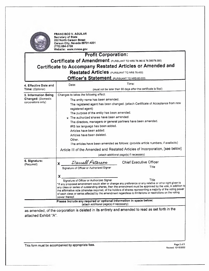 (A) The total number of shares of all classes of capital stock which the Corporation shall have authority to issue is Two Billion Twenty-Five Million (2,025,000,000) shares, comprised of Two Billion (2,000,000,000) shares of Common Stock, with a par value of $0.0001 per share (the “Common Stock”), and Twenty-Five Million (25,000,000) shares of Preferred Stock, with a par value of $0.0001 per share (the “Preferred Stock”). Subject to the preferential rights of the Preferred Stock and such restrictions as may be imposed by debtholders of the Corporation and its subsidiaries, the holders of shares of Common Stock shall be entitled to receive, when and if declared by the Board of Directors, out of the assets of the Corporation which are by law available therefor, dividends payable either in cash, in property or in shares of capital stock.