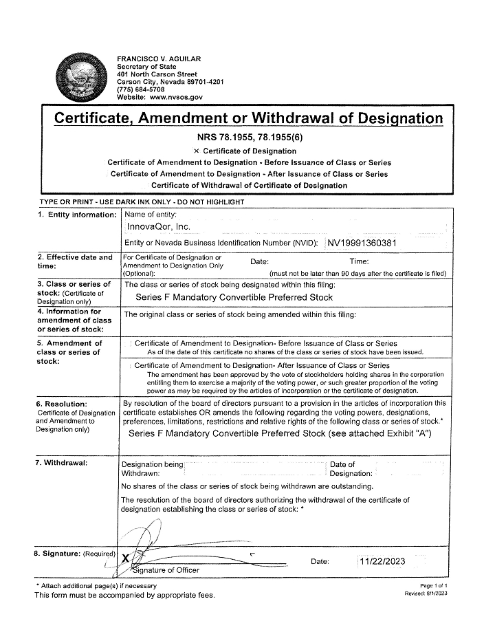 (a) Notices. Any and all notices or other communications or deliveries to be provided by the Holders hereunder shall be in writing and delivered personally, by e-mail attachment, or sent by a nationally recognized overnight courier service, addressed to the Corporation, at the address of its principal executive offices, Attention: Darrell Peterson, email address dpeterson@innovaqor.com, or such other e-mail address or address as the Corporation may specify for such purposes by notice to the Holders delivered in accordance with this Section 10. Any and all notices or other communications or deliveries to be provided by the Corporation hereunder shall be in writing and delivered personally, by e-mail attachment, or sent by a nationally recognized overnight courier service addressed to each Holder at the e-mail address or address of such Holder appearing on the books of the Corporation. Any notice or other communication or deliveries hereunder shall be deemed given and effective on the earliest of (i) the date of transmission, if such notice or communication is delivered via e-mail attachment at the e-mail address set forth in this Section prior to 5:30 p.m. (Eastern time) on any date, (ii) the next Trading Day after the date of transmission, if such notice or communication is delivered via e-mail attachment at the e-mail address set forth in this Section on a day that is not a Trading Day or later than 5:30 p.m. (Eastern time) on any Trading Day, (iii) the second Trading Day following the date of mailing, if sent by U.S. nationally recognized overnight courier service, or (iv) upon actual receipt by the party to whom such notice is required to be given.